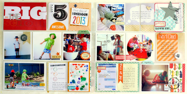 I created a little flap using a cut up sleeve, My youngest came home with his first pieces of art work from kindy, they were too big to fit in my album so I took a photo of them and printed them out!